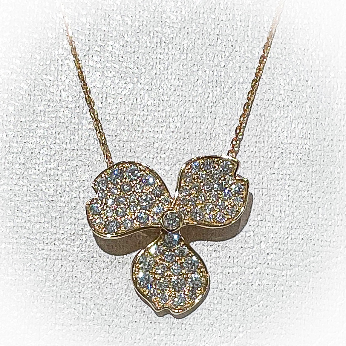 ダイヤモンドペンダント K18 2021年6月20日 by ijima クローバーモチーフのペンダント K18PG の地金に透明なホワイトダイヤモンドをパヴェ加工で埋め込みしています。 パヴェとは、フランス語で石畳。 規則正しく埋め込まれたダイヤモンドが美しく存在感を出して煌めいています。 ダイヤモンド 1.00ct ¥198,000税込