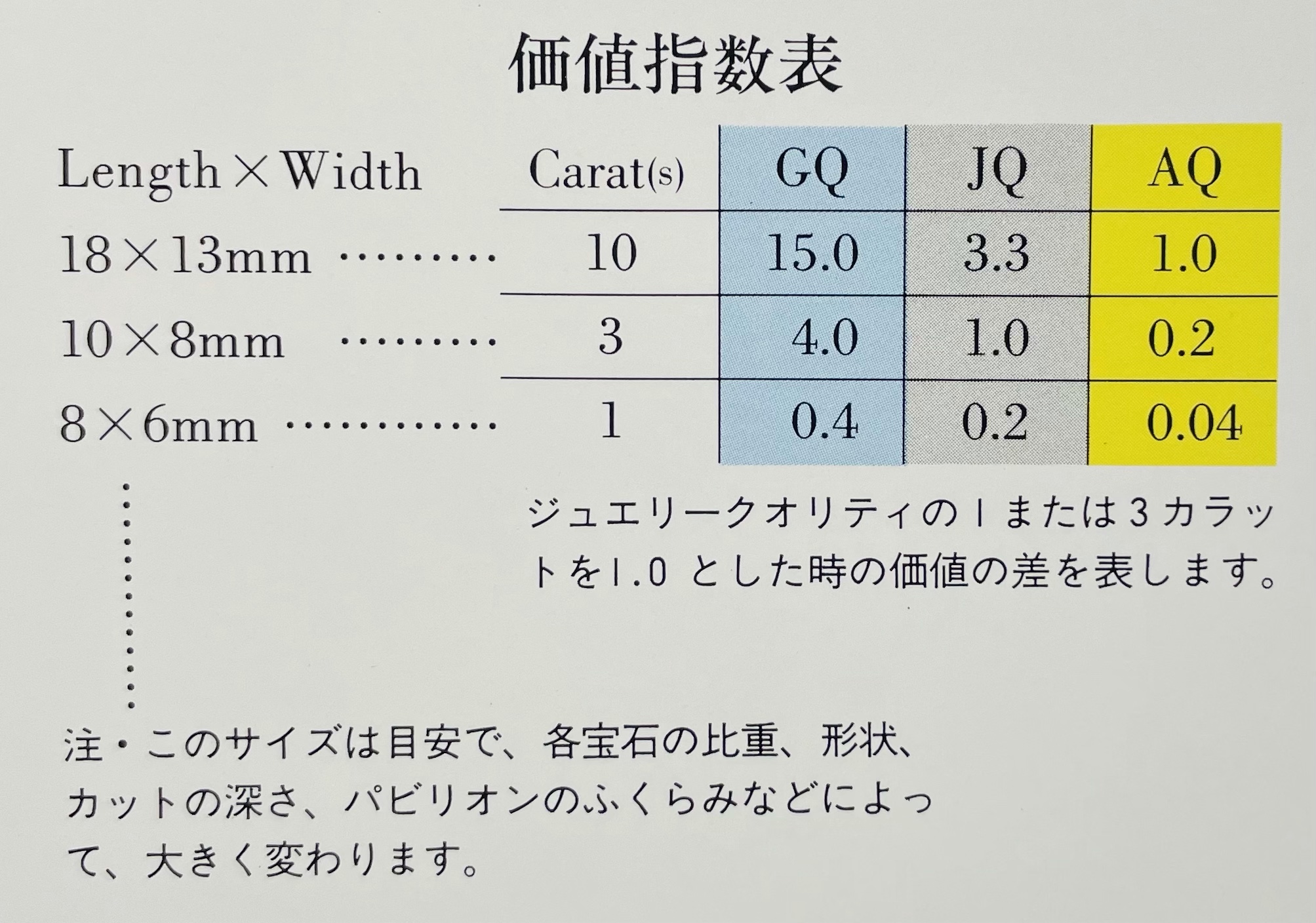 価値指数表 2021年8月10日 by ijima 価値指数表 ジェムクオリティ(GQ)・ジュエリークオリティ(JQ)・アクセサリークオリティ(AQ)ごとに、3つのサイズ価値を「価値指数表」で表しました。