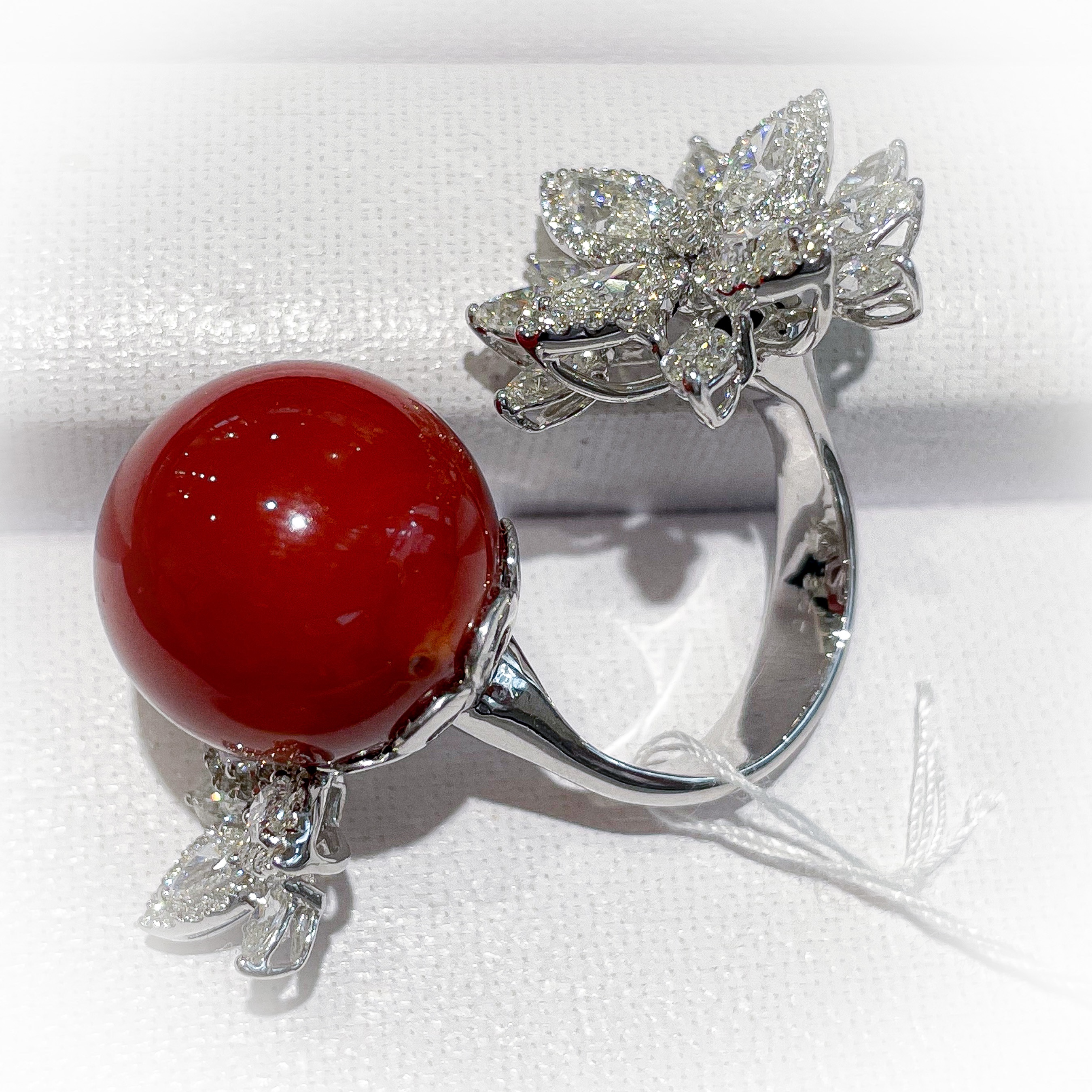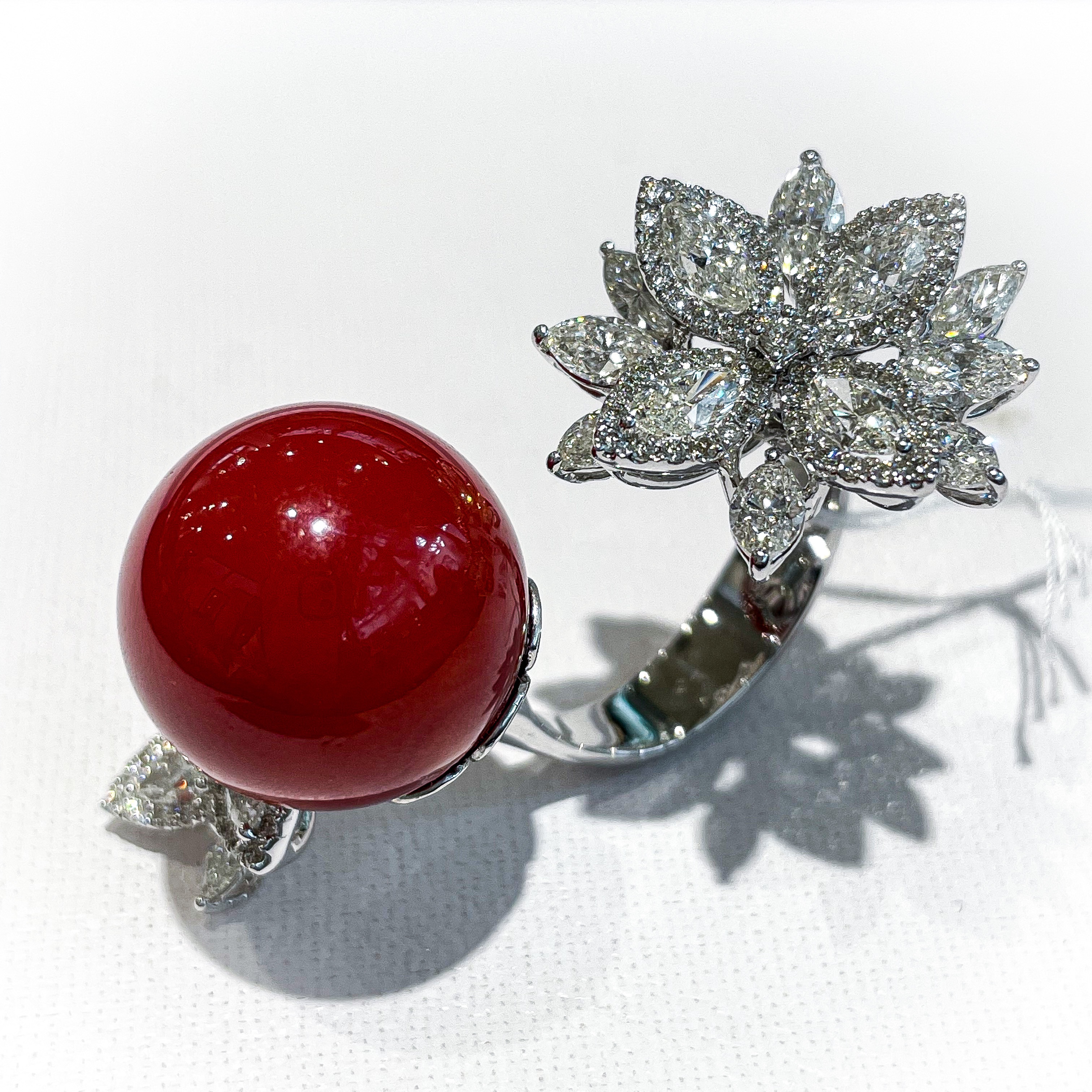 血赤珊瑚 巨大丸珠リング 2021年10月4日 by ijima 血赤珊瑚 16.5mm D-3.55ct 血赤珊瑚 自体が産出もなく高知では、数十年間、15mmを超える珠はみたことがない。 これはお客様のおもちの珊瑚を預かり、私がデザインして作らせた逸品です。 角度を変えてごらんください。 指輪にはめてみると大きな珊瑚の丸珠は、指と指の間に配置されることになる。