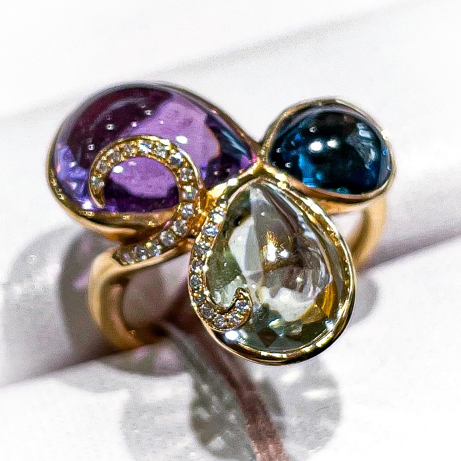 マルチリング 2021年10月17日 by ijima マルチリング 半貴石のカボションカットをマルチに合わせてリングに。 K18PG と ダイヤモンドが煌びやかジュエリーにエレガントと可愛いさを閉じ込めました。 10万円税別でご提供いたします。
