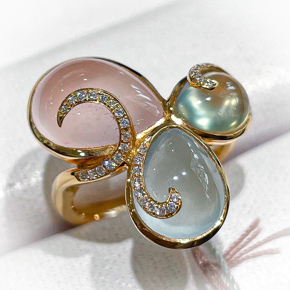 マルチリング2 2021年10月18日 by ijima マルチリング 昨日に紹介したマルチとは、少しフェミニズムな中間色を使い、優しい雰囲気に仕上げました。 K18PG と ダイヤモンドのデザインは全く同じです。 こちらのジュエリーも 10万円税別でご提供いたします。