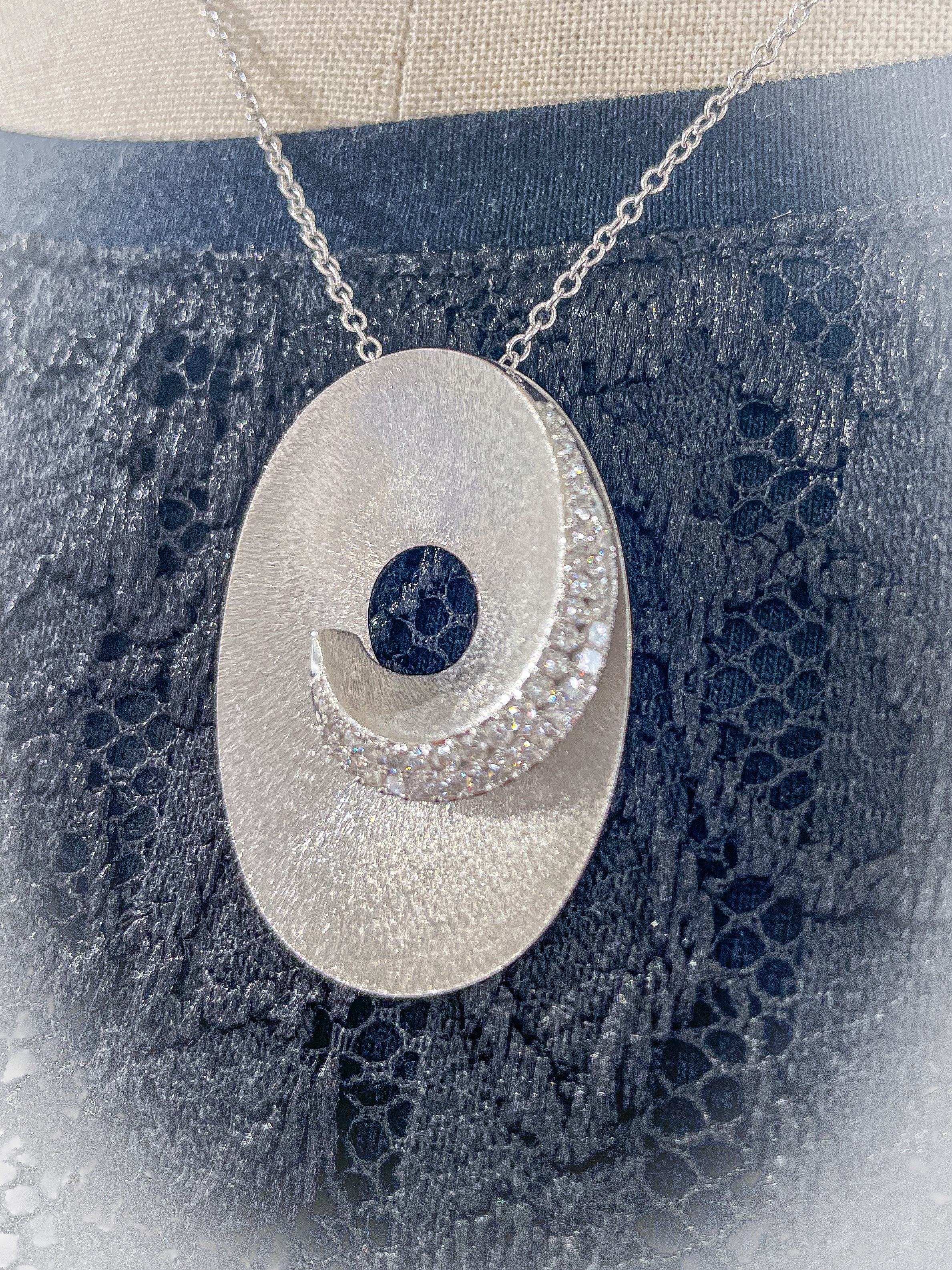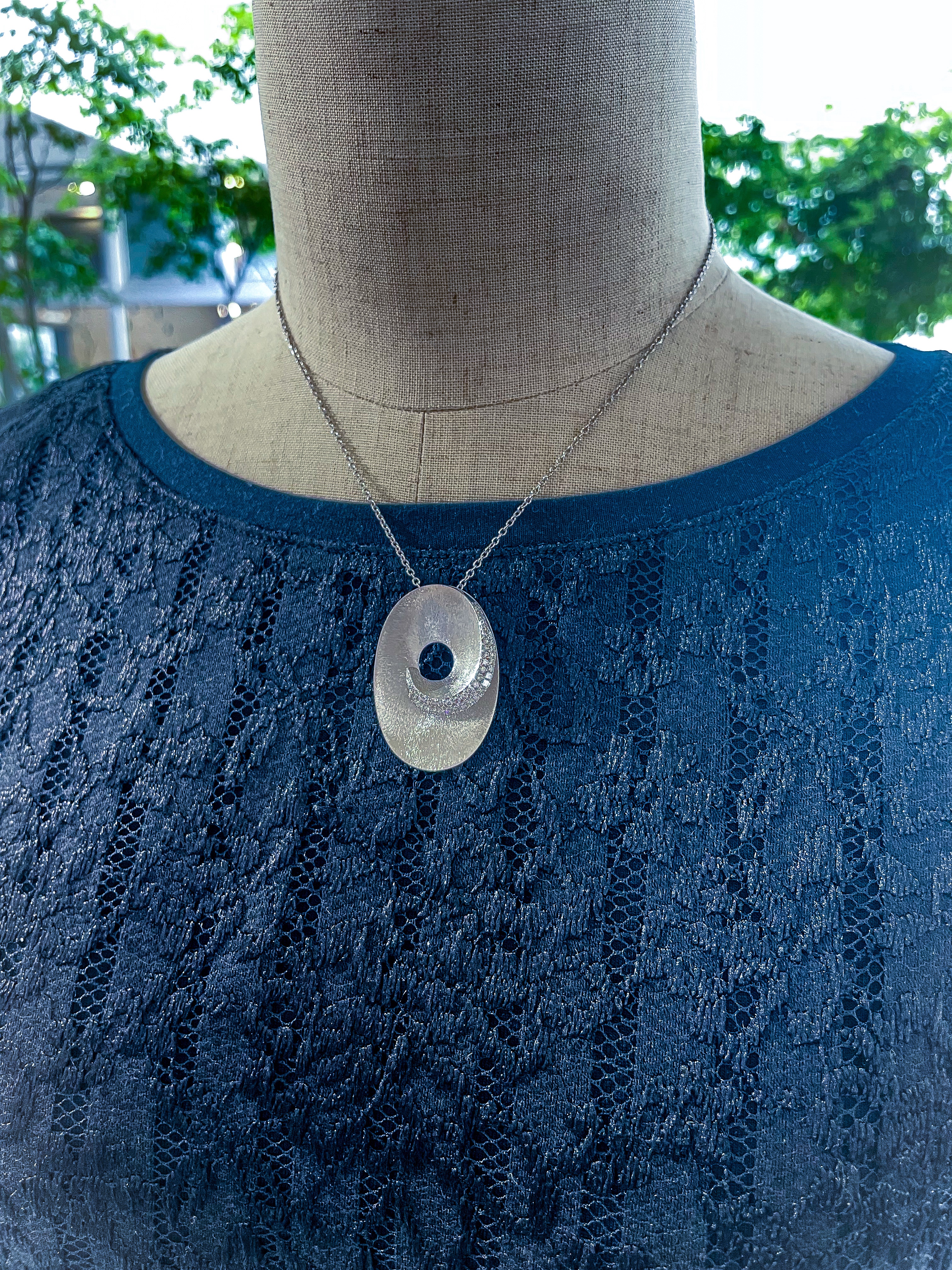 カジュアルペンダント 2021年10月22日 by ijima K18WG ダイヤモンドペンダント ダイヤモンドカジュアルペンダント 秋冬のセーターに大きめのボリュームあるペンダントは必須アイテムになります。 地金をテクスチャして重みあるデザインにしていますが、意外に軽いので着けやすくなります。 K18WG ダイヤモンドは、0.70ct 使用。 価格は税込400,000円でご提供いたします。