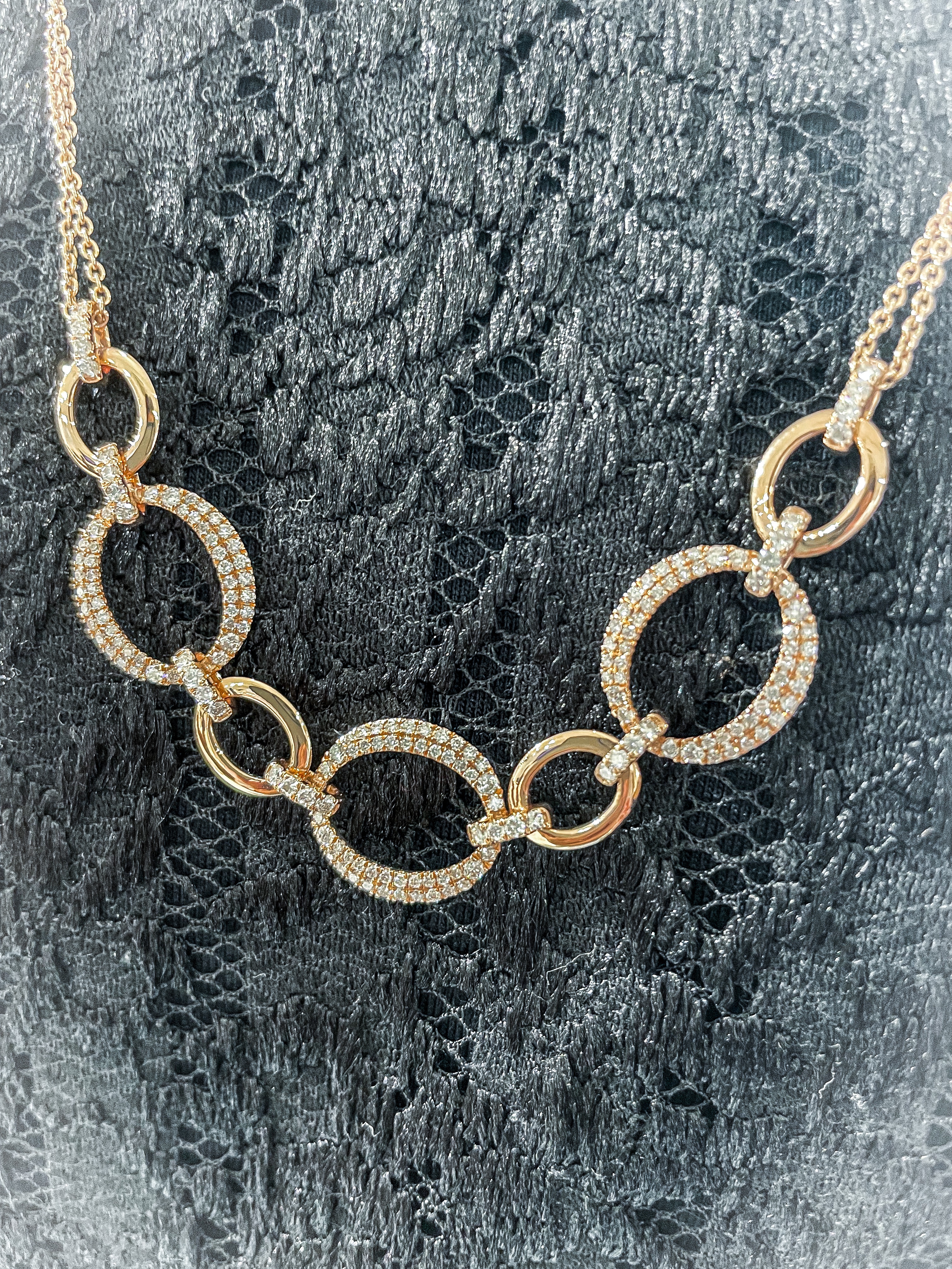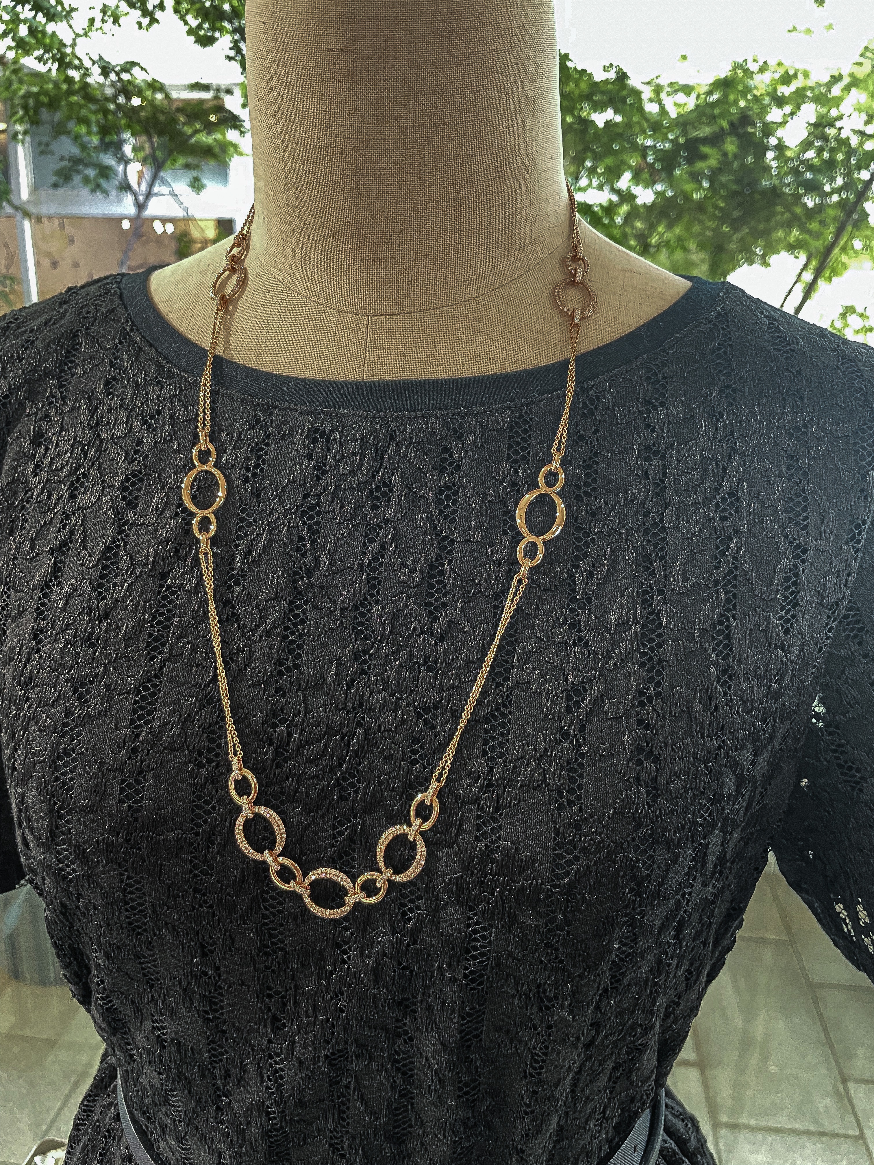 ダイヤモンドロングネックレス 2021年10月26日 by ijima ダイヤモンドロングネックレス ダイヤモンドロングネックレス K18PG ネックレスとダイヤモンドパーツの組み合わせは、目新しく、秋冬の洋服の色合いにも温かみを感じ使い安いと思います。 特徴は、とにかく軽い。 ダイヤモンドも綺麗なメレダイヤモンドを使用していますので、キラキラと輝きます。 ダイヤモンドの総キャラは3.00ct 価格は、税込120万円でご提案いたします。