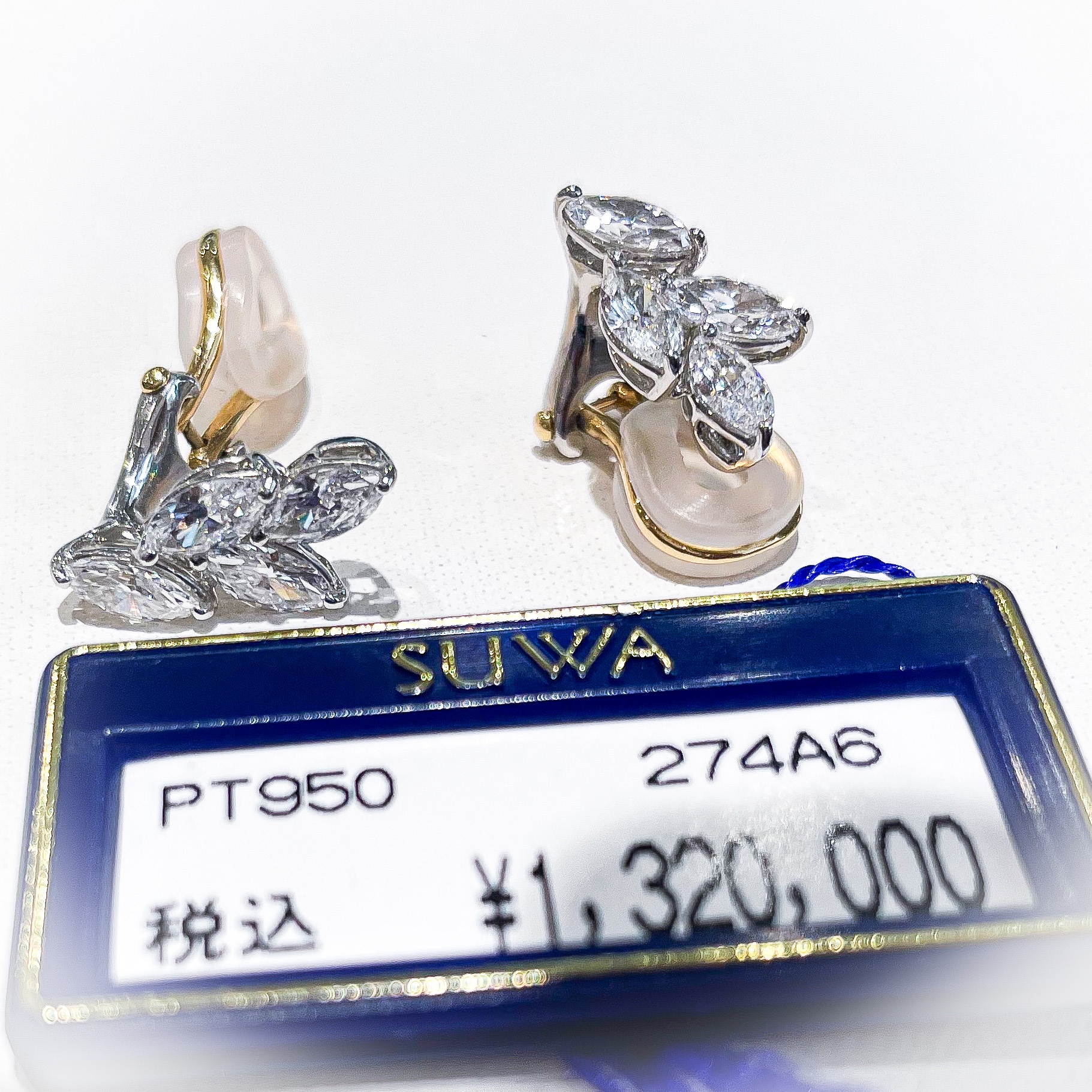 マーキスダイヤモンドイヤリング 2021年11月26日 by ijima SUWA マーキスダイヤモンドイヤリング Pt950 シェープカットのダイヤモンドを買う場合、在庫のたくさんある店で比較することも大切です。 透明感、分散光の調和、姿の良さ、動きを伴ったときの煌き。 それらを比較して一番美しいと思うものを選んでください。