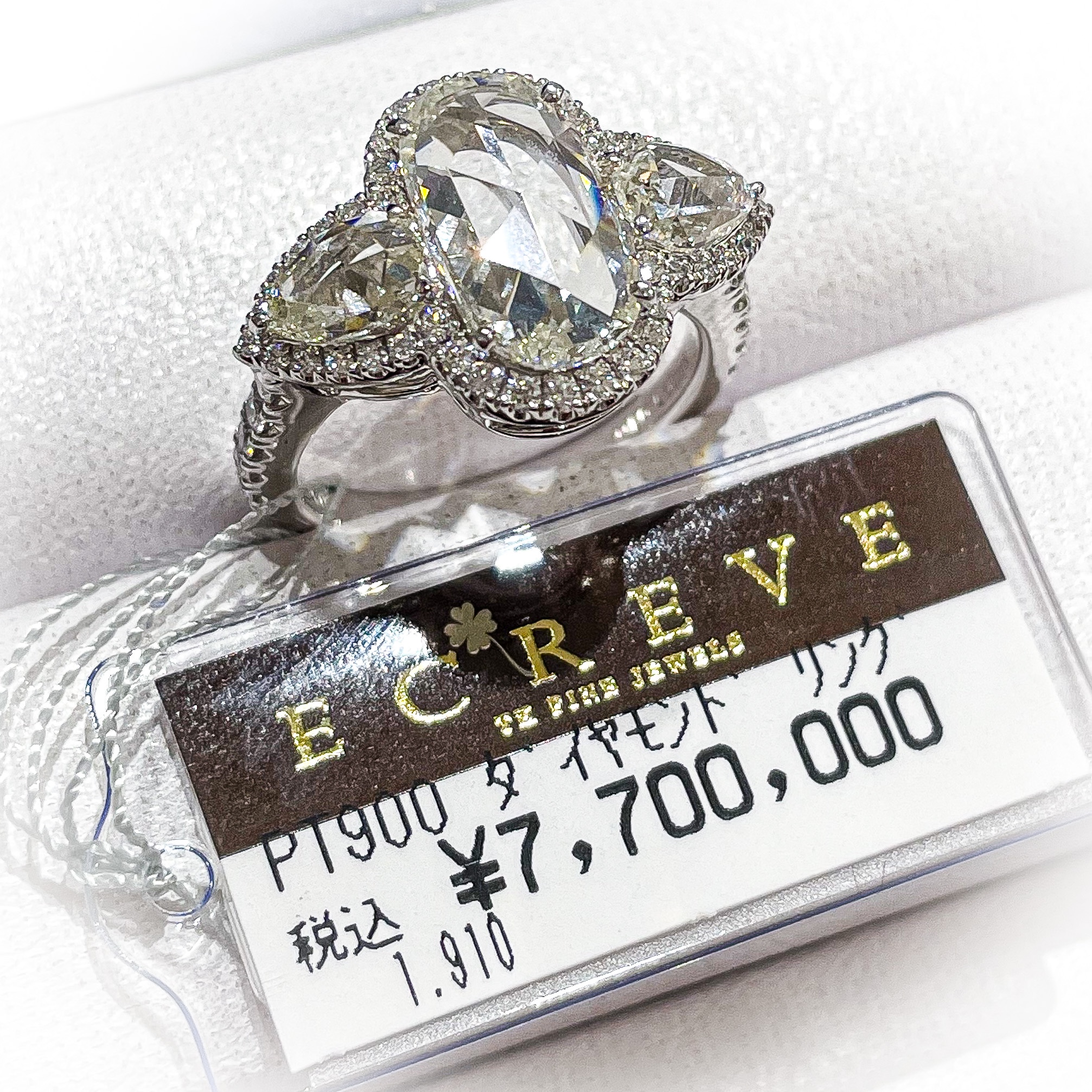ローズカットリング 2021年12月10日 by ijima 中石 ローズカットダイヤモンド 1.910ct 脇石ローズカットダイヤ 1.37ct PT900枠 ローズカットの単体では、国内にあるものでも、数点しかない大粒なものです。 通常のオーバルカットより、見た目の場面は大きく見えるので、5ct近いダイヤモンドに見えます。