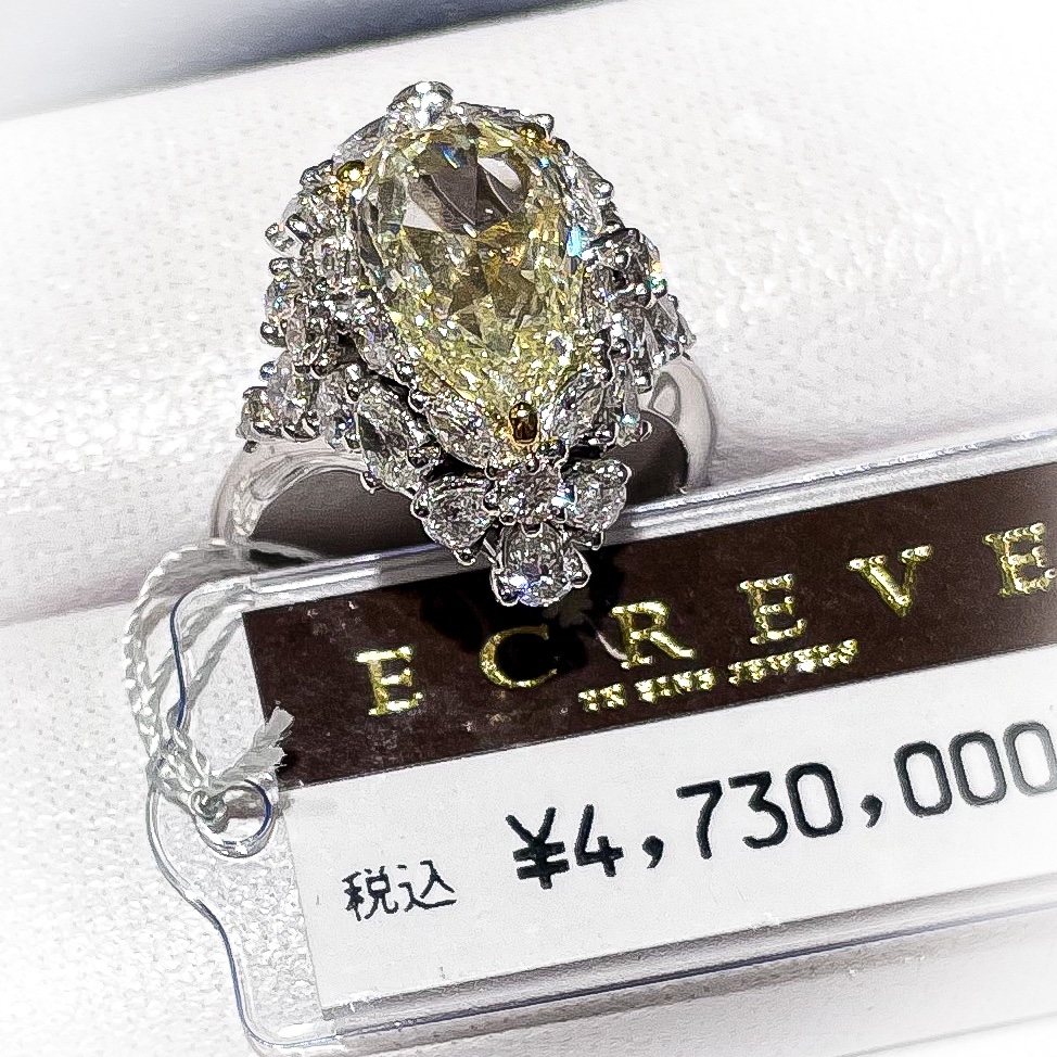 傷や色味などが、カットによってごまかせないので、もともと美しいダイヤモンドしかカットできないことから、高く販売しないといけないのですが、材料としては人気があるのですがメインダイヤとして人気薄で安く取引されていたからです。