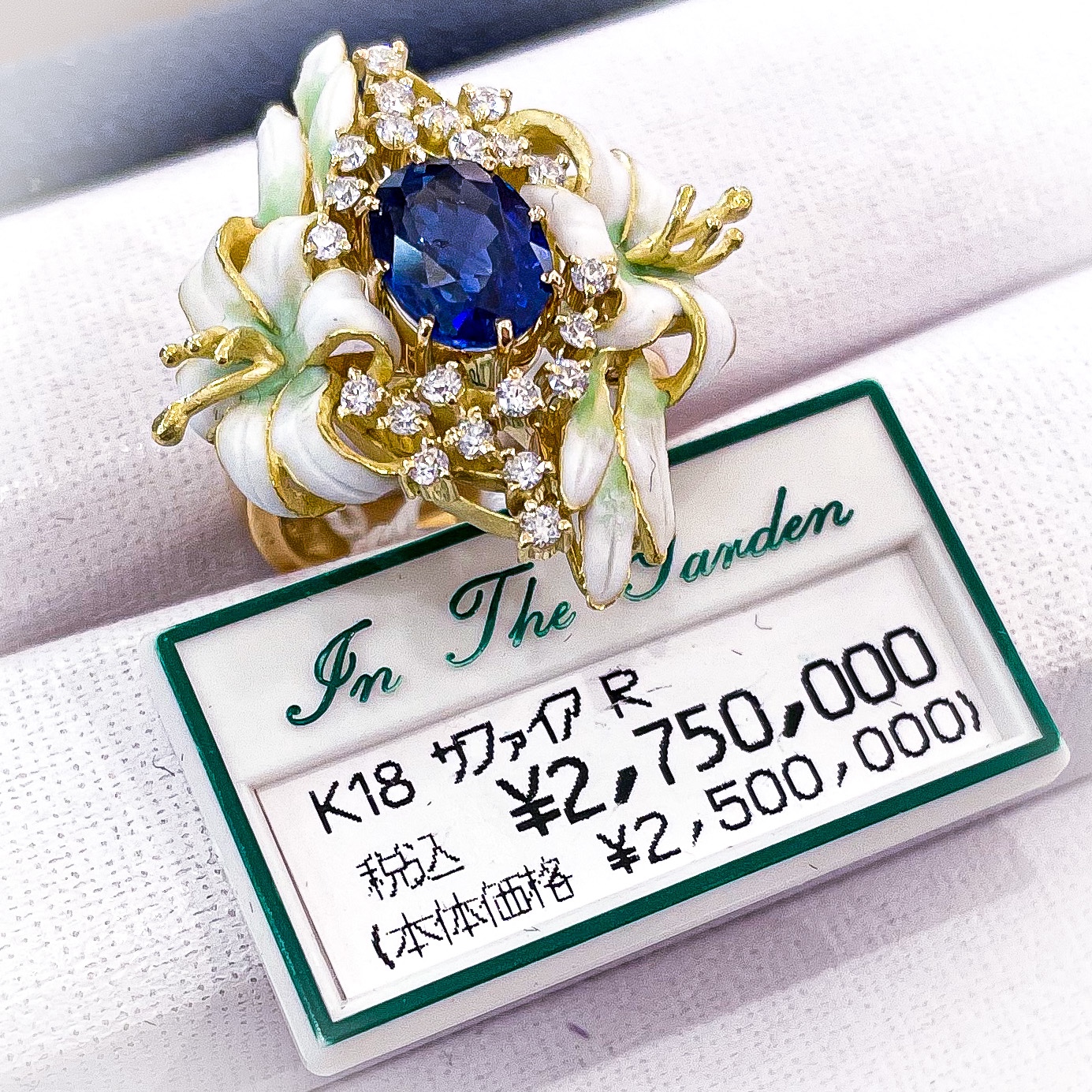 中嶋邦夫エマーユ 2021年12月17日 by ijima 中嶋邦夫 ユリ バスタイユとサファイアを使用して、ユリを見事にあらわしたリング。 白とグリーンのバスタイユのグラデーションが見事。 サファイア 2.58ct ダイヤ 0.44ct